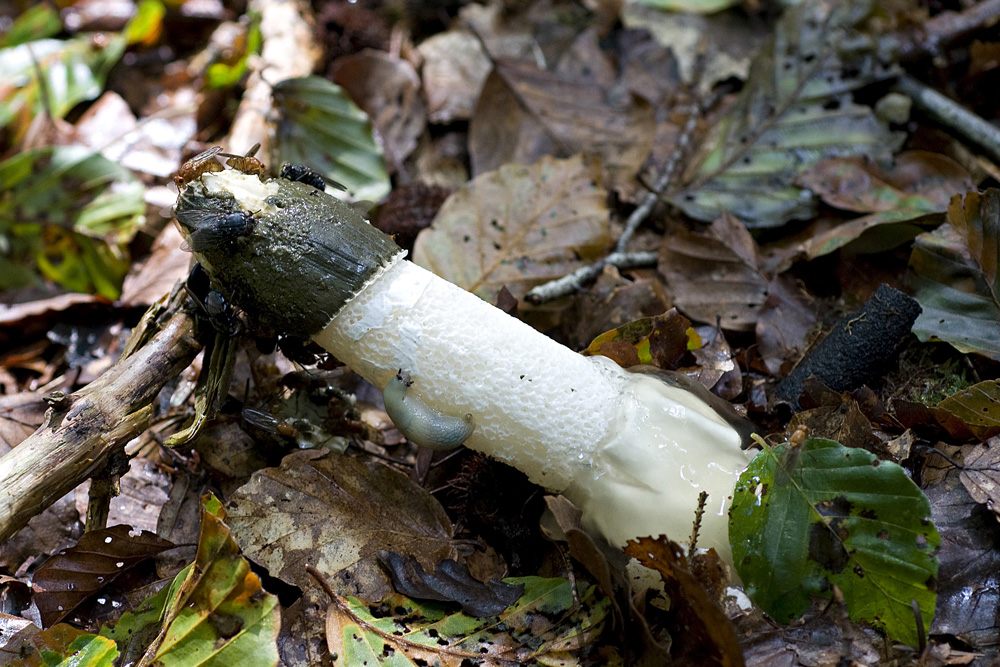 Mit der Dünen - Stinkmorchel Phallus hadriani. Mit der Europäischen Schleierdame Phallus impudicus var. pseudoduplicatus = Phallus duplicatus Bosc ss. auct. europ. Die noch jungen Hexeneier der Stinkmorchel mit den jungen Fruchtkörpern des Tintenfischpilzes Clathrus archeri = Anthurus archeri und den noch kleineren Hexeneiern der Hundsrute. |